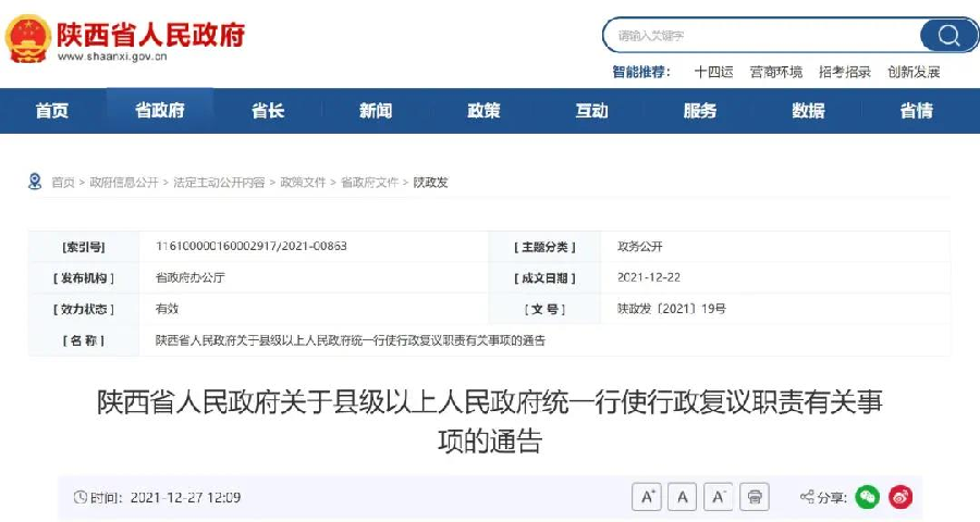 为落实党中央国务院关于行政复议体制改革的决策部署,按照《陕西省行政复议体制改革实施方案》要求,现将我省县级以上人民政府统一行使行政复议职责有关事项通告如下: